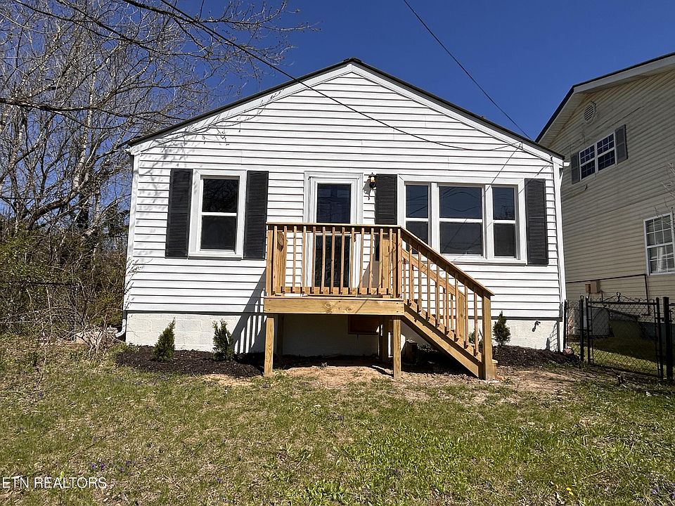 Newly remodeled bungalow in Harriman TN! This home features two bedrooms, one bathroom, a light and bright living room, huge laundry room/mud room and a beautifully updated kitchen. This home just became much more energy efficient with the addition of all brand new vinyl windows and a mini split heating and cooling system. Additional upgrades include luxury vinyl plank flooring, interior paint, stainless steel range and hood vent, sink, countertops and painted cabinets. Outside features a fully fenced front yard, brand new entrance deck and a gravel parking pad.
