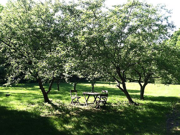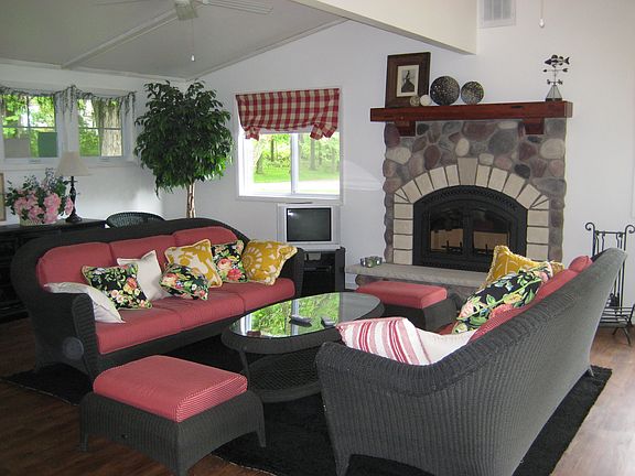 Unusual home that must be seen to be appreciated. Located on double lot and updated with large great room and stone fireplace. Four + bedrooms, screened porch, patio and deck for enjoying the outdoors. Cedar Siding and newer roof with skylights. Year round home or great summer place in private secluded setting near shopping and restaurants. The perfect setting complete with Bay views, appple orchard, two wooded areas, lots of lawn. Fenced property. Private. Boat launch 300' from drive.