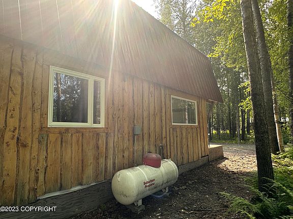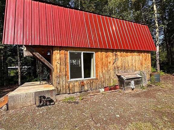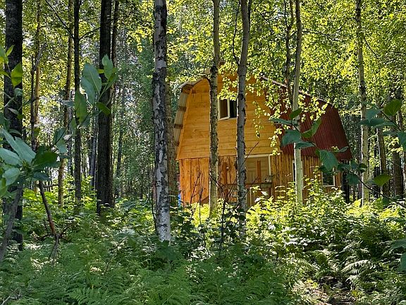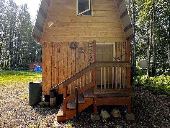 Cute cabin on 4.38 acres under $150,000! Private acreage with access to the East West Express trail from your yard, connex is included for storage. Great for weekenders or year round living, two bedrooms and two bathrooms make this an amazing get away for friends and family. Beautifully treed with lots of wildlife, Northern Lights viewing in the winter and year round maintained road acess.Kitchen has an electric range & oven, refrigerator & washer dryer hookups.There is a Toyo stove and newly installed propane heater for warmth without power.