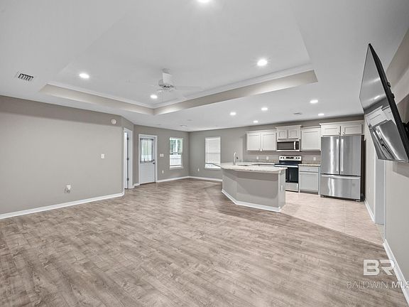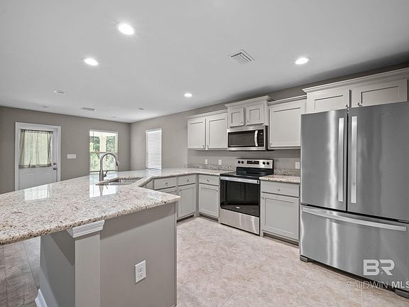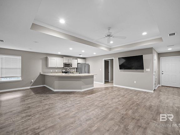 Check out this better than new home with no HOA in desirable Robertsdale, Al. This Silver Fortified 3 bedroom, 2 bath offers custom wood cabinets, luxury vinyl plank and ceramic tile flooring, stunning granite countertops throughout, Whirlpool fingerprint resistant stainless steel appliances, single tray ceilings in living area and primary bedroom. The spacious primary bathroom features a double vanity with under mount sinks, 5 ft shower and generous size walk-in closet. This home has been very well maintained with fresh paint throughout. Experience peace and tranquility in the very private back yard under the covered patio. Buyer to verify all information during due diligence.