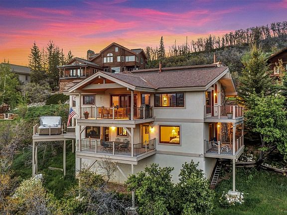 Perched at the top of Glacier Ridge at the end of a private drive is this extraordinary estate with breathtaking views of Mt. Werner, the South Valley, the Flat Tops and beyond. This 4 bedroom, 4.5 bathroom house was designed to take advantage of the views at every turn. There are carefully curated design elements, made with the finest of materials and top-notch craftsmanship throughout the home. The great room has cathedral tongue and groove ceilings, a stunning river rock fireplace and a breakfast nook that looks out over the ski mountain. The dining area is situated next to a lovely brick fireplace and just steps away there is access to a stunning deck offering the perfect place to dine alfresco while enjoying panoramic views. The kitchen features custom cabinetry, granite counters, stainless steel appliances and a cozy breakfast bar. Additionally on the main level is a spacious primary suite showcasing jaw-dropping views, with a luxurious ensuite bathroom and a beautifully designed walk-in closet. As you head down the stairs you have access to a deck that quite possibly is the most fantastic place in the valley to take in alpenglow sunsets while soaking in the jacuzzi after a long day of adventuring. On the lower level is a vast family room with wet bar and stove as well as three additional bedrooms each with ensuite bathrooms and access to a private exterior deck with sweeping valley views. The home is complete with a two car garage with lofted storage area and an additional store room for all the gear needed for your mountain lifestyle. Right upon entry from the garage is a landing zone, mudroom with laundry for the ultimate convenience. This meticulously maintained home has new windows and doors throughout and the hardwood floors have been recently refinished. Property is located just minutes from the slopes and offers hands-down one of the most epic views of the ski resort and valley. This property truly is a must see to appreciate all it has to offer.