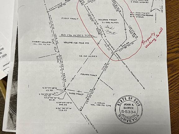 Nearly 22 mostly wooded acres with 1422ft of road frontage including property where mobile home sits.. The poured concrete pad rents for $325 and has electric (AEP), water. There are fence posts and/or fence lines. White posts in back. (Mobile home does not stay). Several nice building sites including a foundation Also lots of wildlife. Additional access to property first paved drive on right on Keiser. The access is recorded. See attached plat map. Property is on the north side of the road. The seller has marked the road frontage with yellow tape also the rear of property. Lots of beautiful building sites. You're welcome to explore. This tract is from a parent parcel that has a Pennington Rd address.