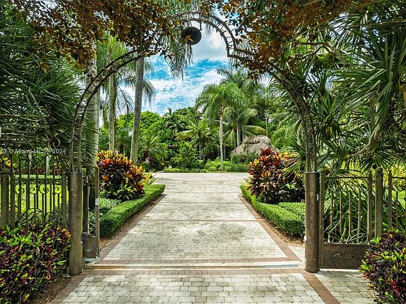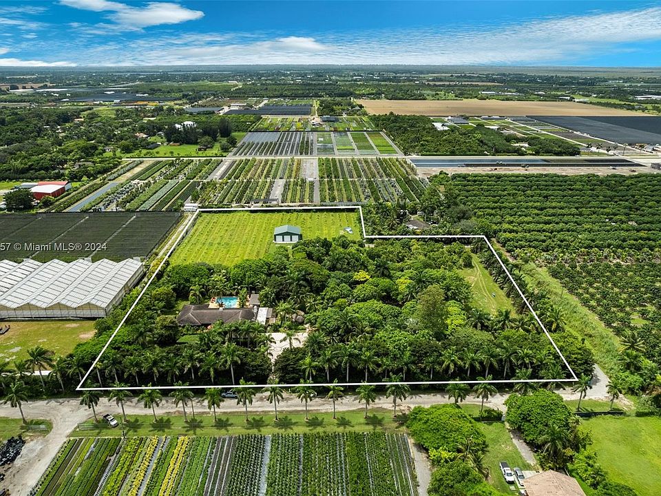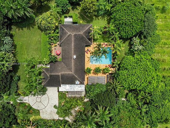 Experience serenity at this 7-acre Redland Estate! This hacienda-style, single story ranch features 4 bedrooms and over 3,700 SF living area in your own private oasis. Features including a formal dining room, living room, bar room, office, kitchen and laundry room. The property boasts a resort-style pool, custom hot tub with cold plunge pool and new poolside outdoor kitchen. Paver walkways lead to a fire pit, second outdoor kitchen, chickees surrounded by lush tropical landscaping and a fruit tree grove. A newly constructed steel warehouse spanning 50X40 feet with 3 spacious bay doors. Fenced and private, and just three miles from the Redland Golf & Country Club.