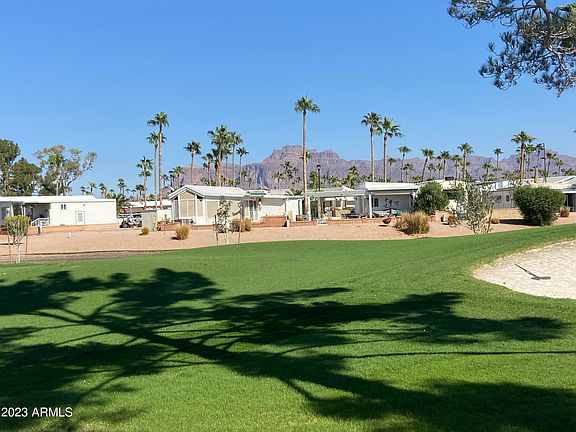 One of the best golf course views in the resort! Sit on your east facing patio and enjoy the view of the Superstition Mtns, ponds and green, green golf course! The wildlife is abundant! This is a well-loved and maintained older park model with inside laundry, spacious Arizona room that doubles as sleeping space for your guests!