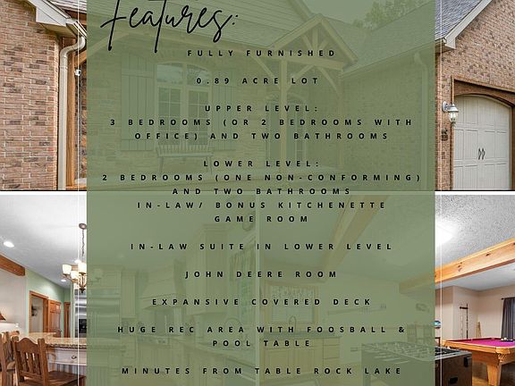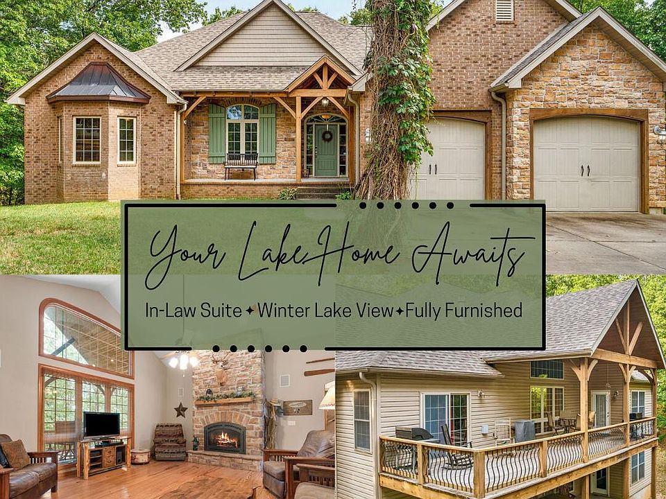 Tranquility of the mountains, but on the lake. Discover the perfect blend of charm and comfort in this 5-bedroom, 4-bathroom home on nearly an acre near Branson West. Featuring a charming cottage-style exterior, rustic lodge-inspired decor, and wood beams with soaring ceilings, this property feels warm and inviting from the moment you arrive.The main level offers 3 spacious bedrooms, a gourmet kitchen, and an open-concept living area that flows seamlessly to a huge covered deck with a winter peep view of Table Rock Lake. The lower level adds incredible flexibility with 2 additional bedrooms, a full in-law suite complete with a second kitchen, and walkout access.Well maintained and move-in ready, this home boasts a new roof (2022), new HVAC (2022), and comes fully furnished--perfect as a primary residence or vacation retreat. Outside, enjoy the peaceful 0.89-acre lot while staying just minutes from Silver Dollar City, Ledgestone Golf, marinas, medical facilities, shopping, and dining.Boat slip options are available through a third party, making lake life even more convenient. Don't miss this opportunity to own a turn-key home in the heart of the Ozarks!