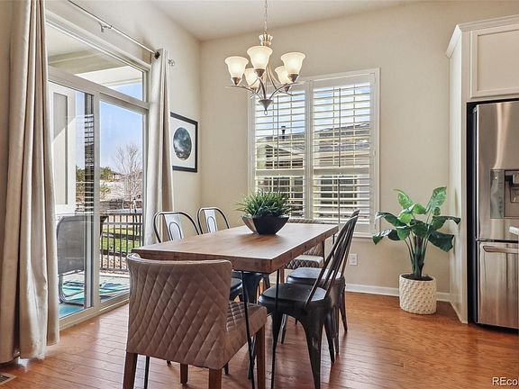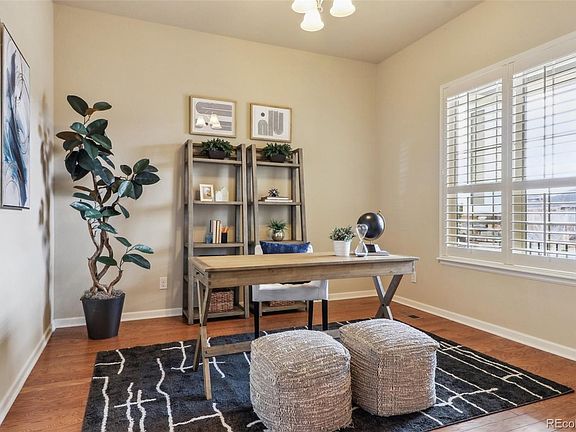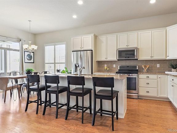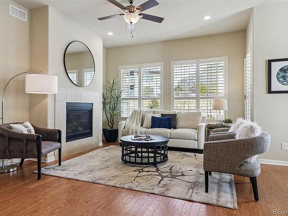 Nestled in the highly sought-after Inspiration 55+ community, this stunning 2-bedroom, 2-bathroom ranch-style home offers the perfect blend of comfort and elegance on a desirable lot backing to a green belt. Designed for easy main-floor living, this home features over $55,000 in builder grades with an open-concept floor plan, natural hardwood floors, and abundant light flooding through plantation shutters. The expansive kitchen is a chef’s dream, featuring white cabinetry, granite countertops, stainless steel appliances including gas range, large pantry, and a spacious island with bar seating. The kitchen and adjoining dining nook connect seamlessly with the light and bright living area centered around a cozy gas fireplace. A main-floor study provides the perfect spot for a home office, hobby space, or add a closet to easily create a third bedroom. The primary suite is a private retreat, complete with an en-suite bathroom and walk-in closet with custom built-ins. A second bathroom and additional bedroom, with its own custom closet system, provide comfortable accommodations for family or guests. An unfinished basement offers ample storage space or potential for future expansion. Outside, enjoy the beautifully manicured landscaping in the front and back yards, and soak in the Colorado weather under the covered back patio. With access to Inspiration’s top-tier amenities around the corner, including walking trails, a clubhouse, pool, fitness center, and social activities, this home provides an exceptional lifestyle in an active adult community. Don’t miss the opportunity to make this beautiful home your own!