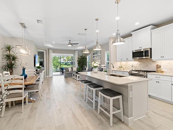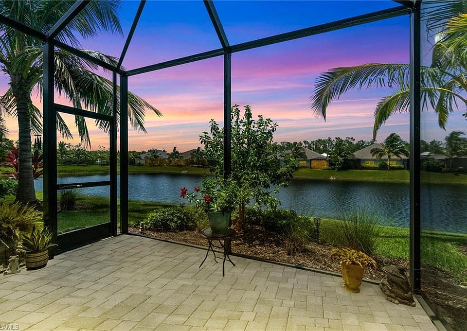 AMAZING LAKE VIEW SUNSETS! Built in 2021, this 2 bed + den/2 full bath home has been thoughtfully designed, combining function, style, and PEACE OF MIND with the latest builder code impact resistant windows and doors! Kitchen features quartz countertops and S/S appliances including gas stove, large island with seating, a charming coffee/cocktail bar area, large pantry closet for storage. The kitchen flows into the large bright dining/living area, ideal for family meals, gatherings and entertaining. Step out onto the screened lanai, with ample room for seating to enjoy the weather and that breath-taking lake view! Split bedrooms for privacy, the spacious owner's bedroom features lots of natural light and lake view, two walk-in closets, large en-suite bath with walk-in tiled shower, double vanities and linen closet. Second bedroom is large with plenty of closet space, and the second bath has tub/shower combo and linen closet - both welcome retreats at the end of the day. Additional front room can be used as den, office or guest room. Active community with pool, clubhouse, dog park, all located just 10 minutes from downtown dining, shopping and sandy beaches.