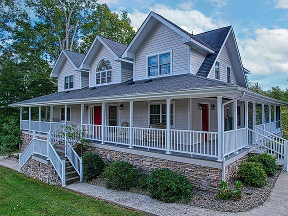 Southern Farmhouse with a modern flair located near the entrance of Carter Caves State Park with 5 bedrooms and 4.5 baths. Popular open concept main floor consisting of large living room area with stone gas fireplace and vaulted pine wood ceilings in addition to dining and gourmet kitchen area with a built in island bar area that features granite counters and high end appliances to include. Wolf 4 burner gas stove, double oven, Subzero double door refrigerator and freezer, built in cabinetry, also 2 dishwasher's built in. Wide plank imported cherry hardwood flooring, large windows and speaker system (inside and outside) throughout. The hardie board siding and beautiful stone work on foundation, covered wrap around porches surround the main floor with a large screened in area for relaxing. The basement area has a patio across the complete back of basement. 3 car detached garage with a full bath also. Gazebo area for relaxation. The mud room utility is located next to side door and 1/2 bath near living area. Main floor hosts master bedroom and bath featured with heated ceramic floors and claw tub. Ceramic tiled and glass door shower, double bowl sinks. Master suite has walk in closets. Solid wood trim and doors throughout house. Custom built staircase to upper floor consists of 2 bedrooms with vaulted wood ceilings. Both have full baths and large closets. Full finished basement with lighted stair case has a walkout to back of house with patio area features another Full kitchen with Stainless Steel appliances. Large family room Movie area with theater seating included. Full size bath, nice home office with separate alarm panel and outside entrance, 2 additional bedrooms and another multi-purpose room. Home is hard wired with liquid cooled propane for a generator system. 1000 gallon propane tank. All this on 3.5 acres! HVAC installed spring 22, hardwood floors refinished in Sept 22. Home also has an underground wireless fence system, with 4 shock collars.