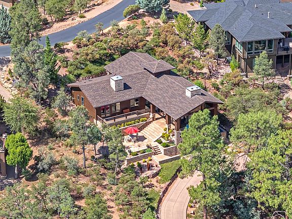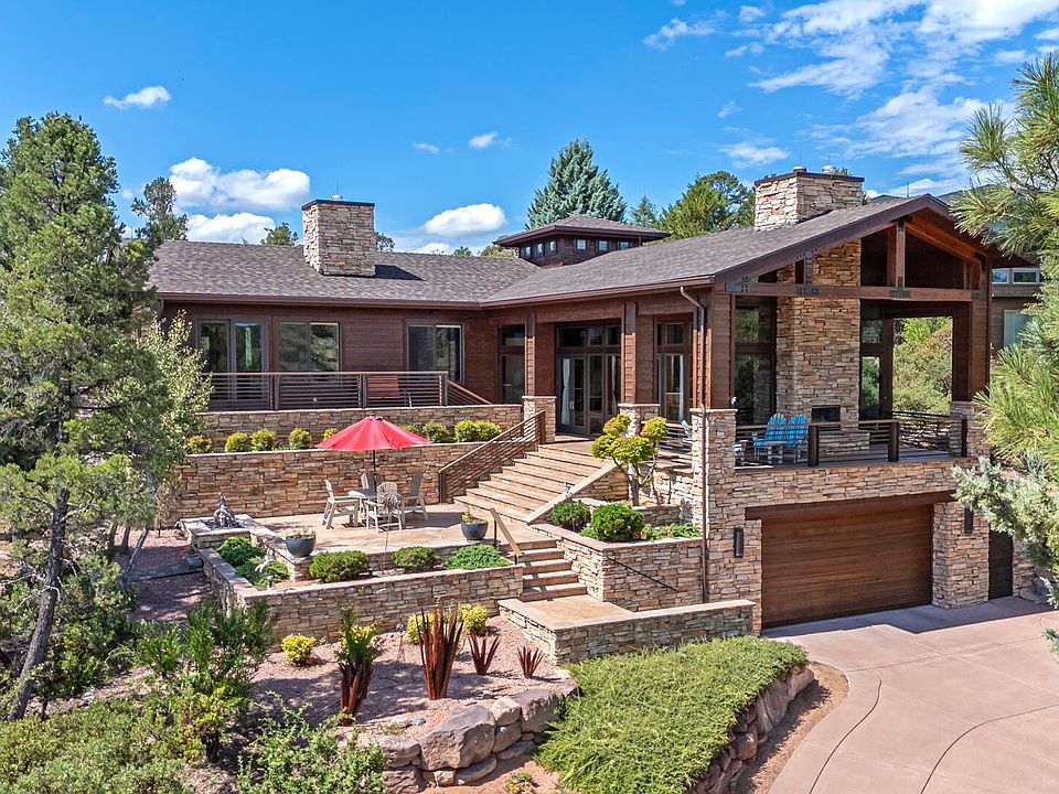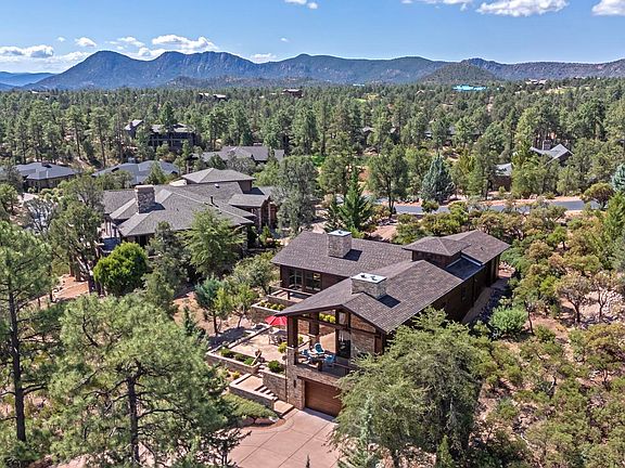 STUNNING, ELEGANT TIERED HOME WITH PANORAMIC VIEWS OF THE MOGOLLON RIM located within the prestigious Chaparral Pines Golf Club! Experience the epitome of refined living in your 3,000 square foot, 3 bedroom, 3 bath, half acre property with golf cart section in the oversized 2 car garage with extra storage room and extra parking space in the back of the property, front facing the Mogollon Rim with huge flagstone courtyard and wrap around deck with fireplace and tons of space for entertaining and outdoor living, gorgeous landscaping to greet you when entering this charming estate property, and an additional private stone patio behind the home. Magnificent Floor to ceiling Pella windows and doors in the great room provide for ultimate viewing of Rim Country, and a massive floor to ceiling dual fireplace with pellet insert in the great room and gas fueled on the deck side provide easy and comfortable temperature control in the cooler months. Natural cherry wood floors and awe-inspiring massive wooden beams in the great room provide for a perfect blend of cabin and contemporary living, and the open dining area is perfectly placed to capture more of the amazing mountain views! Take it all in! Your beautiful gourmet kitchen overlooks the great room area and has its own unique and beautiful raised roof with windows all around for maximum natural light. Upgrades in kitchen include a large sub-zero refrigerator, Bosch dishwasher, 5 burner Décor gas cook top and large granite kitchen island and silestone countertops. The private stone patio behind the home has access from the kitchen and has a built-in grill, for convenient outdoor cooking. The delightful cherry hardwood floors lead you into the third bedroom/den and down to the master bedroom where they transition to hickory hardwood floors.