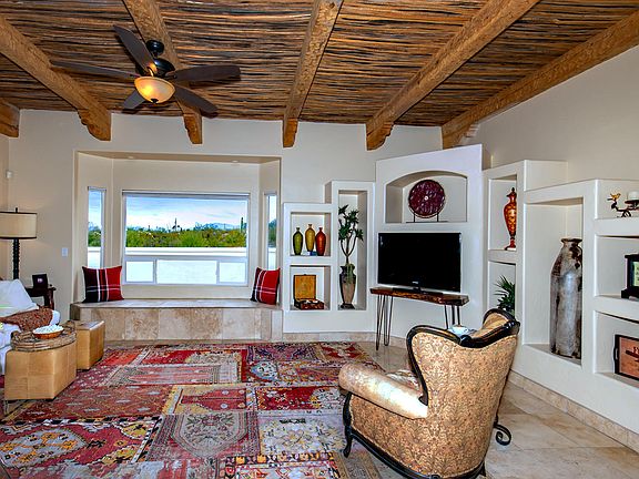 Gorgeous 360 degree Mtn views abound from this professionally renovated hm. A lrg gated courtyard leads to a home boasting high ceilings, large light-filled living spaces, hard surface flooring throughout enhanced by 2 custom fireplace's & beautiful wood cabinetry throughout. The large center island kitchen island offers quartz counters, stainless appliances, double ovens, hammered copper sink, walk-in pantry, wraparound breakfast bar in addition to separate eating area. The family rm exudes character w/it's hand-carved beams, corbels & saguaro rib ceiling. The charming dining rm enjoys an inviting fireplace w/add'l storage & built-ins. Private mstr suite enjoys dual walk-in closets, walk-in rainhead shower, oversized jacuzzi & dual copper sinks. Huge rear yard w/views & tons of space.