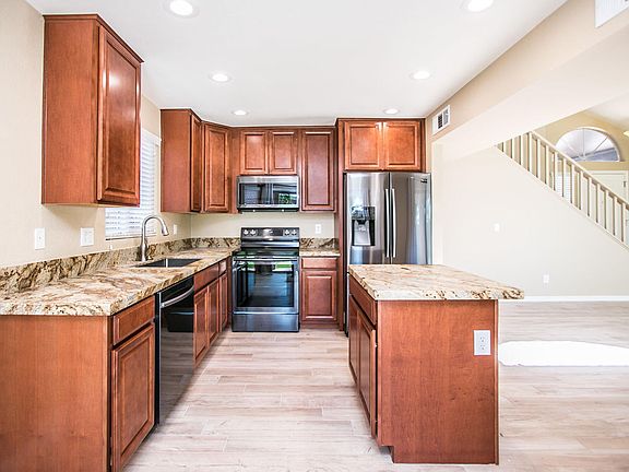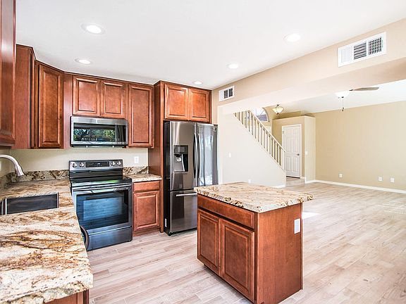 Totally remolded amazing 3-bedroom, 2.5 bath home. Features include leather granite counter tops, upgraded 42'' solid wood cabinets w/soft close, island, stainless-steel appliances, oven can also is Convection w/Roasting & Baking, leather granite in both bathrooms, both baths have tiled surrounds, new wood-look tile & carpet installed in the last two months, new a/c unit as of May 2017. Light bright open floor-plan with a eat in kitchen great for entertaining. Master bedroom is roomy with a walk out balcony that overlooks lush landscaped yard. This home is Move in ready!! Great location & community w/community pool & heated spa, walking trails, tennis courts and HOA maintains front yard landscape what more could you ask for!!