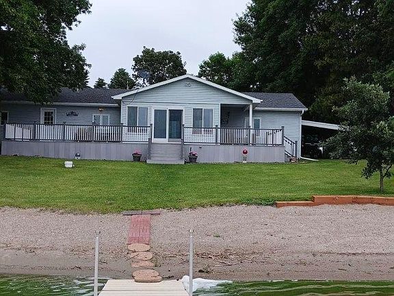 Have you been dreaming of a lake home with level lakeshore and sandy beach? This 3 bedroom, 1.5 bath home on Red Rock Lake is approximately 25 minutes west of Alexandria. Enjoy the 111 ft of shoreline/lakeview from the 4 season sunroom or the maintenance free deck. Inside, you'll love the flow of the spacious kitchen, dining, living room and gas fireplace. Three bedrooms, full bath & laundry are all on the main level. The lower level offers a family room, 1/2 bath and utility room. The attached single garage, carport and large newer shed provides all the space you need. On the lakeside, there is another shed for all your fishing gear and lake toys. Fish off of the dock for walleyes and crappies. Dock is included with sale. This lake home comes mostly furnished with beds, dining