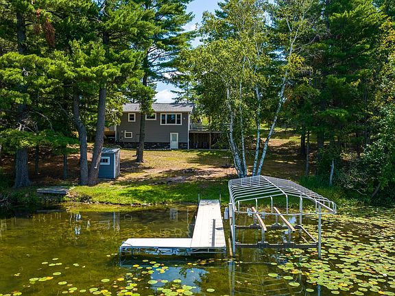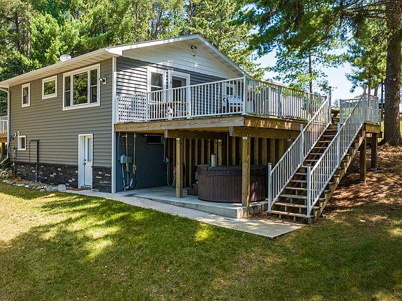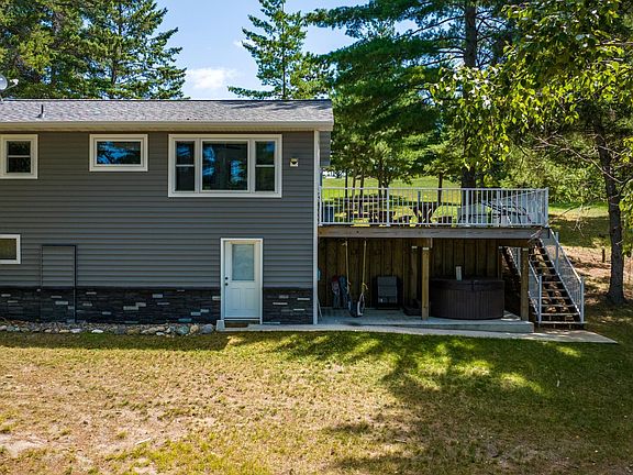 Surrounded by pines, this year-round 2 bed, 1 full bath cabin offers many recent upgrades including shingles, maintenance free siding, windows, air source heat pump, hot tub area and massive deck for entertaining. The unfinished lower-level walkout is great for storage. The lot boasts 162' of level shoreline and 1.65 acres to roam. Complete with detached garage and stunning views out over Miller Bay, this property has so much to offer, only minutes from Nevis.