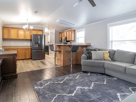This one might just be for you! 2008 mobile home has three bedrooms, two bathrooms and a large, open living space. Very nice finishes are complemented by sleek, modern appliances - washer and dryer are included with sale! Lot measure 50x140 with concrete driveway in front and alley access in back for lots of additional parking space. Skirting has been upgraded and concrete walkways have been poured around home. Sellers will consider leaving shed with acceptable offer. Call for a showing today!
