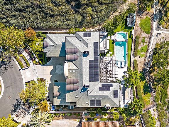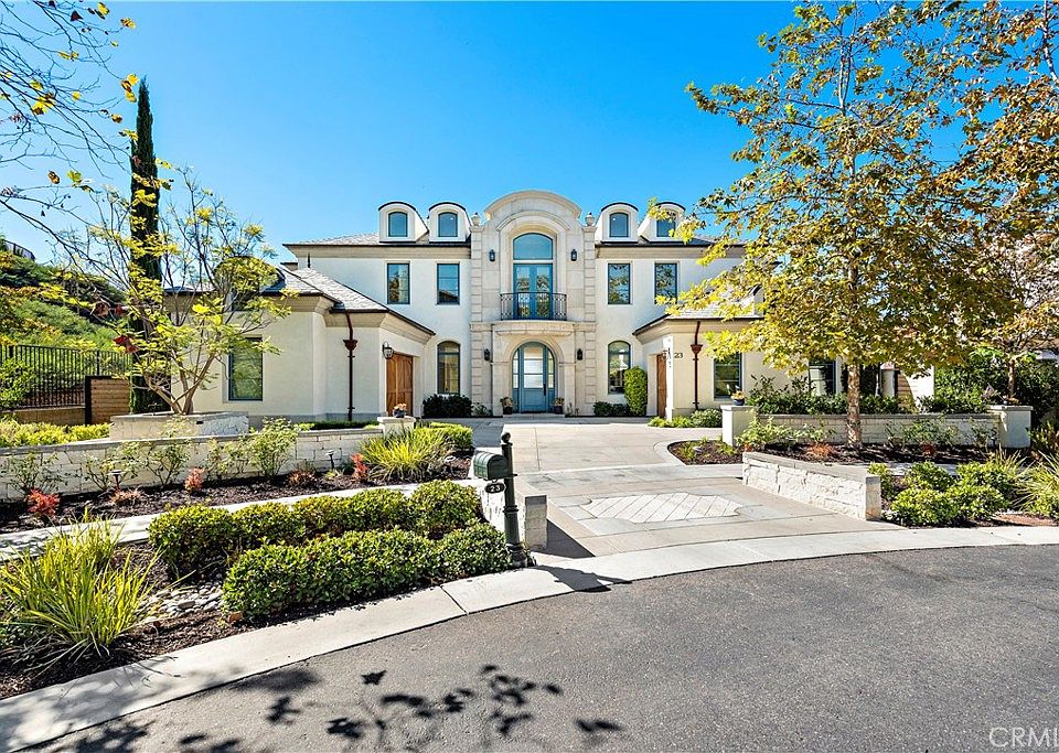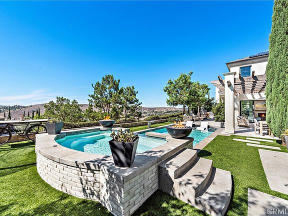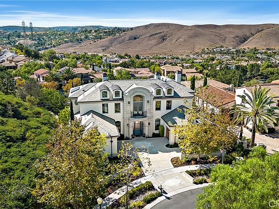 From its outstanding setting to its impressive list of amenities, this exquisite custom estate at Ladera Ranch’s guard-gated Covenant Hills collection is one of the finest homes within the entire community. With a commanding presence on an elevated homesite at the end of a cul-de-sac, the residence has only one direct neighbor and showcases picturesque views overlooking rolling hills and sparkling evening lights. Classic and stately, refined architecture graces the exterior, while interior spaces blend timeless elegance with contemporary flair. Approximately 7,100 square feet, the estate features an arched entry door, a two- story foyer with a dramatic ceiling crowned by arched dormer windows, a floating spiral staircase, and a massive living and dining room space anchored by a sleek fireplace at one end and oversized glass pocket doors that open to the sunny patio. See-through cabinetry accentuates the transition from dining room to kitchen, were chefs of all skill levels will appreciate a dual-height island with seating, quartz countertops, a built-in desk, a built-in cabinet-matched refrigerator, La Cornue range, Wolf Appliances, a built-in Dacor wine station, and a built-in Miele coffee center. A fireplace warms the open family room, where a brick accent wall, surround sound and patio access are featured. Fun for everyone awaits on the basement level, which is highlighted by a home theater with large projection screen and tiered seating, a lounge area, game room with kitchenette, and a wine room with refrigerated storage. Five bedrooms, five baths, two laundry rooms, an office/gym, and a secondary bedroom loft space provides fun and versatility. Personal luxury defines the primary suite, where a sunny view deck, walk-in closet's with built-ins, a freestanding tub, steam shower, separate vanities and Anne Saks tile finishes. Unsurpassed craftsmanship is evident through the incorporation of chic contemporary lighting fixtures, wood and tile flooring, tray ceilings, and beautiful tilework. Solar power, a three-car garage and whole-house audio are also included. Entertain in style as grounds boast a resort pool and spa with fountains and fire bowls, an outdoor kitchen with AMG grill, a large covered patio and several fruits trees and raised garden boxes. Truly special in every way, the estate is close to Covenant Hills’ private clubhouse, award-winning schools, miles of scenic trails, a skate park, a water park & shopping centers.