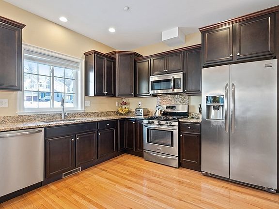 Pristine, West-facing end unit townhome available at Westfordâs popular Graniteville Woods! Spacious main level with open floor plan and hardwood flooring throughout, 9-ft ceilings, sprawling living room with gas fireplace, built-in cabinetry, sitting/remote learning area with bay window and an abundance of natural light. Elegant kitchen features granite countertops, dark espresso stained cabinets, stainless steel appliances, walk-in pantry, peninsula/breakfast bar and dining area with slider out to an exterior deck, perfect for relaxing during the warmer months. Upstairs are three carpeted bedrooms, full bath with double sinks, and laundry closet. Lower level has a finished bonus room and 2-car garage with additional parking spots in front of unit and plenty of guest parking directly across from unit. Top ranking school system. Enjoy all that Graniteville Woods has to offer with sidewalks throughout the complex, two private playgrounds, open space and access to nearby walking trails.