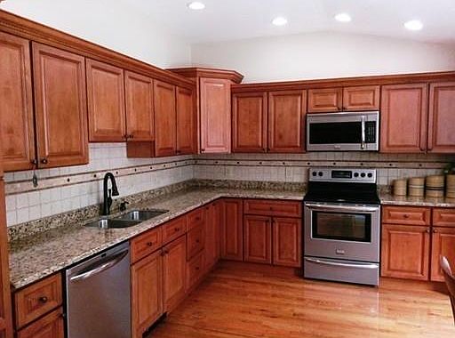 Open House 10/4 ... 12-2 . Price reduced. This home has been meticulously cared for and pride of ownership and care shows throughout. Low maintenance home with vinyl siding, replacement windows and hardwood flooring and tile throughout the home. Gorgeous new kitchen addition with top of the line cabinetry, granite counters and appliances. Kitchen has access to deck and cleared, level back yard bordered by trees. Large kitchen with eat in area or move into dining area in front to back living room/ dining room combination. Stove adds warmth and coziness to this beautiful room. Half bath, garage access and basement access finish off the first floor. Second floor has more gleaming hardwoods, 3 light filled bedrooms and beautiful remodeled full bath.