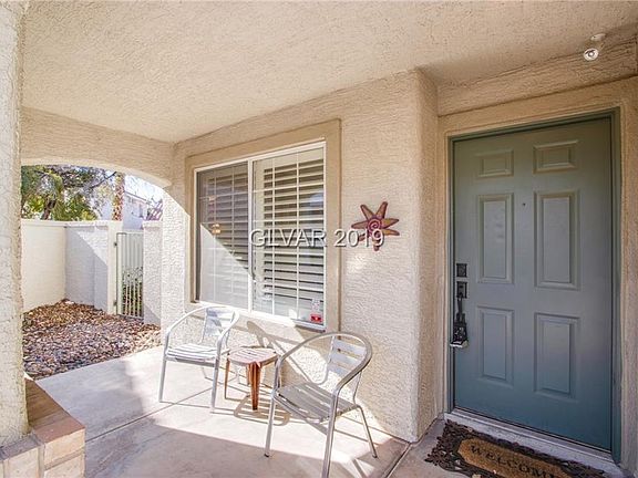 Adorable single-story Henderson home in Pebble Creek community! Kitchen w/island & backyard access. Window shutters throughout. Cozy fireplace in dining area. Audio system includes speakers in living room, kitchen, master bedroom, garage & rock speakers in back. Cute covered porch in front & covered patio in back. Digital alarm system & surveillance system. Charming brick front. Neighborhood playground, park, dog park, basketball court.