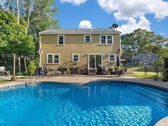 Cancel your summer vacation plans and buy this home. It is truly a "staycation" home. This beautiful 3 bedroom, baths gambrel on a quiet cul-de-sac offers a great-sized family room, dining room, living room, and an oversized welcoming foyer. A good-sized eat-in kitchen with its own coffee bar connects directly to the backyard oasis that features a large patio, in-ground, heated, saltwater swimming pool, and fire pit. Back inside the home on the second level are 3 good-sized bedrooms and one full totally updated jack & jill bathroom. The partially finished basement provides an inside refuge offering an huge entertainment area with beautiful fireplace with ample space to entertain your guests or find quiet solitude. Close to all major highways, shopping, restaurants, T-Station and more. 23belena.com Value range pricing. Seller will entertain offers between $525,000.00 -$550,000.00