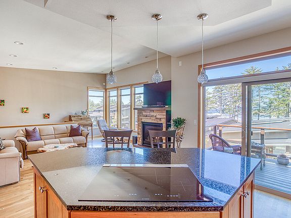 Welcome to this nearly-new contemporary home in the exclusive gated KOHO community, offering breathtaking simultaneous views of the ocean, bay, and Yachats River. Just steps from beach access, this open-concept home features vaulted ceilings, large windows that flood the space with natural light, and elegant oak hardwood floors. The kitchen is equipped with upgraded Bosch appliances, and a cozy stone fireplace with a gas insert warms the living space. Stay comfortable year-round with a ductless heat pump for heating and cooling. Ocean, river and Bay view balcony with trex decking. The two-car garage with storage and heat. The HOA covers exterior maintenance, landscaping, and grants access to top-tier amenities, including a clubhouse, exercise room, and billiard room More About Yachats & the KOHO Lifestyle: