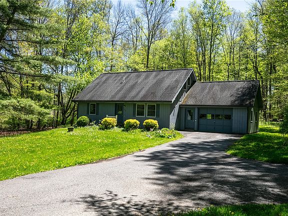 Peaceful retreat in the woods. Enjoy 1.5 acres with mature trees, figure 8 trail through back woods. Wildlife abounds. $25,000 in a newly renovated kitchen since ownership. HVAC: ducted forced air heat and AC via an energy efficient heat pump. 2 bedrooms, full bath, and laundry on main level. Upper level with bedroom, full bath, and office. Both baths recently renovated; tiled shower, modern vinyl flooring, and fixtures. New interior paint. House is all electric average utility of $175/month. Well with holding tank to help ensure no water shortage. Hookup in garage for generator. Radon mitigation system in place. Large shed with ramped entrance. Expand your square footage by converting attached garage to family room.  Be sure to ask your Realtor for the 3D tour. Less than 10 minute drive to City of Ithaca, Cornell and Ithaca College. Sellers reserve the right to review all offers at a later date.