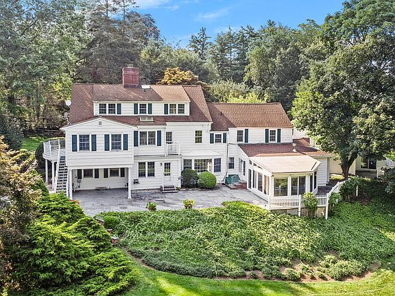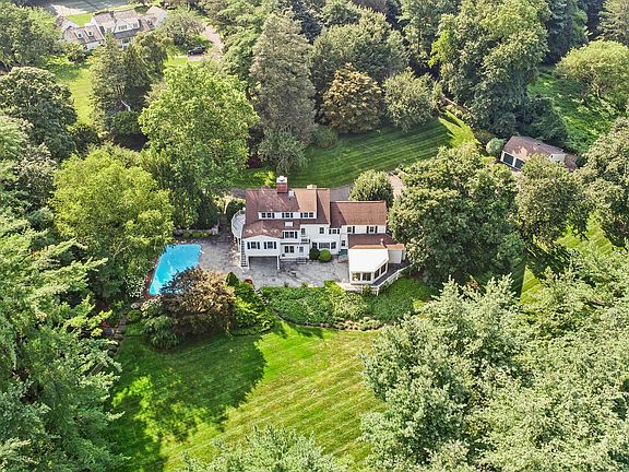 An elegant Colonial on 2½ stunning acres at the end of a quiet, sought-after lane near downtown is ready for a new vision and your own imprint. Spacious living room with fireplace opens to expansive terrace and swimming pool. Formal dining room, library and 4-season sunroom offer picturesque views of the sweeping landscaped grounds. Chef's kitchen and pantry are adjacent to family room. Upstairs a front-to-back primary suite has large walk-in closet and balcony overlooking the pool. Three more bedrooms on the 2nd floor and two more on the 3rd floor. An elevator connects 1st and 2nd floors. Guest house with family room, 2 bedrooms, kitchenette and more, offers maximum optionality, being connected to the main house but with direct exterior access. Opportunities are immeasurable.