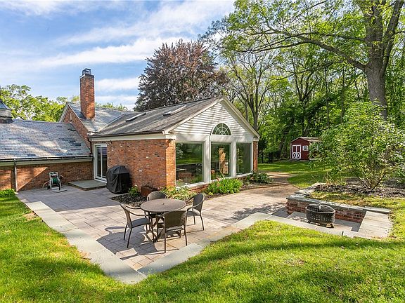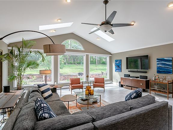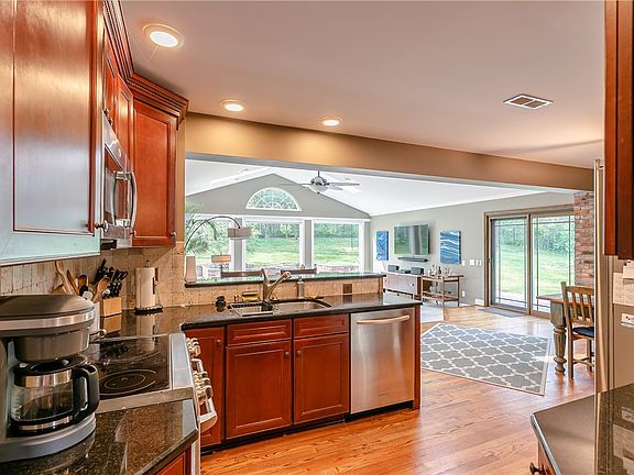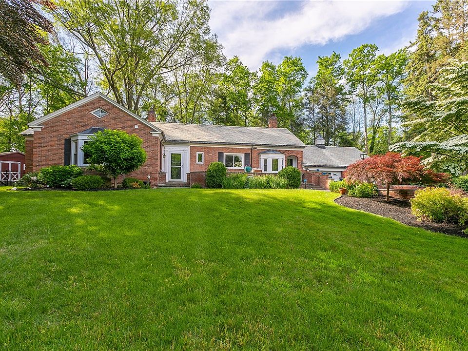 Beautifully maintained ranch nestled atop a little hill on nearly 1 acre of wooded property, with lush gardens. Brick exterior and gorgeous slate roof, and 2 patios surrounded by a park-like setting. Entering the foyer onto travertine tile, the floor-plan opens up before you. Formal dining area with hardwood flrs and custom moldings, formal living room/library with arched ceilings and wide doorways, cozy fireplace and huge windows. Updated eat-in kitchen with granite countertops, ss appliances, 42" cherry cabinets, walk-in pantry, and a convenient breakfast bar that opens into the massive great room with cathedral ceilings. New 12x24 modern tile throughout this room, and offers spectacular views through a wall of windows of the back patio and gardens. Hardwoods run down the hallway that provides 1st floor laundry, and into both first floor bedrooms. Owner's bedroom offers 2 large walk-in closets, and a gorgeous en suite bathroom with heated floors, and glass shower. You will be thrilled to find nearly the entire basement is finished with living room, fireplace, loads of storage, office/studio space, and 3rd bedroom with egress window and full bath. Delayed Negot: 6/22/21 6pm