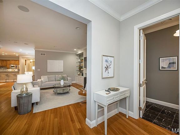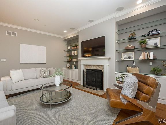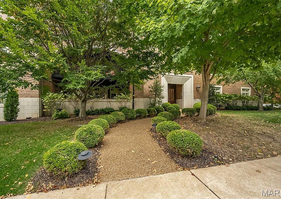 Luxury 1-level garden condominium beautifully designed & stylishly appointed to accommodate daily comfort & gracious entertaining. Open floor plan features 10’ ceilings, full-height windows with plantation shutters & maple hardwoods that extend throughout the main living area. Impressive entry foyer leads to stunning living room with marble fireplace flanked by built-in display cases & wall of windows with atrium doors that open to private terrace and formal dining room. Culinary enthusiasts will love the designer kitchen with 42” maple cabinetry, granite countertops, Viking appliances, 9’ peninsula & butler’s pantry. Spacious primary bedroom suite with 2 customized walk-in closets & marble bath with jetted tub offers an appealing retreat. A 2nd ensuite bedroom plus convenient laundry complete the living quarters. Elevator access to parking garage & storage unit. Premier location just minutes from shopping, fine dining, Clayton business district & Shaw Park.