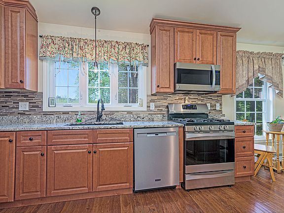 This beautiful ranch style home features over 2500 square feet of living space, and it is set on a beautiful 1.92 acre property with a private pond. The bright, open main level has a custom kitchen with a very large island, granite counters, tile backsplash, and stainless appliances. There is a spacious living room with a stone fireplace and sliders to the back deck, and a lovely formal dining room. The primary suite opens to the back deck, and has a walkin closet and a full bath with a tile shower and a soaking tub. Also on the main level is a second bedroom, a half bath, and a laundry/mud room. The finished, walkout lower level has a large family room, a bedroom, and a full bath. There is also a large unfinished section of the basement for storage and possible future expansion of the living space. Features include air conditioning with 3 mini-split units, vaulted ceilings, and energy efficient propane heat. There is a private, paved driveway, underground utilities, private well, and public sewer. Great cul-de-sac location, with easy access to local amenities such as shopping and restaurants, and easy commuting to the highway and to Rhode Island locations. This property is in immaculate, move-in condition. Be in your new home this summer!