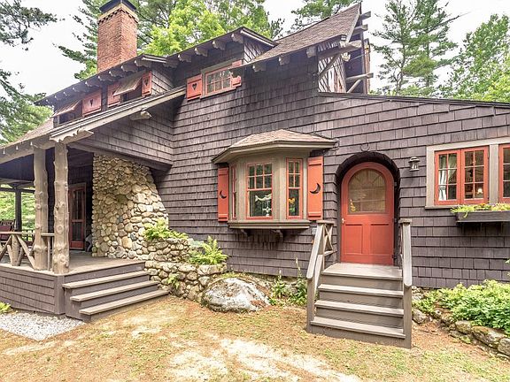Stunning Adirondack Style 1908 historic vintage home on 5 acres in Intervale, NH. High integrity with many intact original interior features: Birch staircase, fireplaces, mantels & stone work. 3-Sided wide veranda with rustic posts, covered balcony off the master, hardwood floors, pine accents, exposed beams. New 4 BR septic system, 2-Car garage/workshop with attached storage shed for tools & toys. 2 French doors lead from the living room to the veranda, dining room window seat, beautiful staircase with birch railings. Designed by J. Williams Beal, a well-known Boston architect. Heated artists studio or office. Invisible pet fence on the wooded acreage. Your own secluded estate close to skiing, hiking and all the wonderful Mt. Washington Valley activities. 5 Minutes from North Conway, Cranmore and X-C trails. Climbing wall and walking trails on the property. Telecommuters take note: Time Warner Cable CAT 6 high speed internet providing 95 mbps throughout the house and studio.