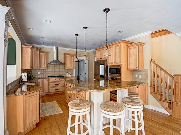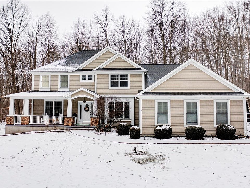 Welcome to this beautiful custom built home nestled on 3.3ac in the Skaneateles school district. The setting is set w spacious front porch. Enter home though beautiful foyer to the right, formal dining rm w custom tray ceilings & left, versatile rm (office/den/piano room/bedroom). The warm & inviting feeling emulated is created by custom woodworking, beautiful crown molding & red oak hardwds throughout. The heart of the home, the spacious kitchen w custom cabinetry, granite counters & breakfast bar that opens to living rm (w gas FP) ideal for entertaining. Large morning rm features cathedral ceiling, exposed beams, wall of windows that overlook serene wooded yard & slider to huge composite deck. Off the kitchen you'll find a "wing" inclusive of a garage entrance w walk-in pantry, walk-in closet, laundry rm and powder rm. 2nd floor features luxury primary bedrm w 2 large walk-in closets & spacious bath, loft (easily converted to bedrm), 2 ample sized bedrooms w walk-in closets & beautiful bath. Newly finished lower level consists of full bath, kitchen/living area, quartz counters, bedroom, closet storage, work-out rm w glass walls & theatre rm w stadium seating (sqft includes bsmt)