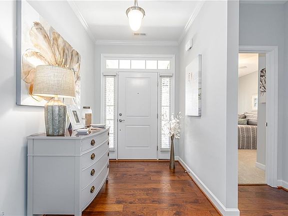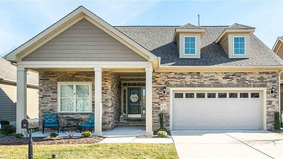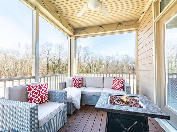 PRISTINE CONDITION AND MOVE-IN READY!! Experience luxurious and maintenance-free living in this exquisite 2 BR, 2 BA detached home in the Villas at Sedgefield. A home office/den easily converts into a 3rd bedroom. The open floor plan boasts stunning architectural details, including high ceilings, arched doorways, tray ceilings, gleaming wood floors, and transom windows, flooding the space with natural light. A warm and inviting family room w/gas log fireplace opens onto gorgeous kitchen featuring granite counters, stainless steel appliances, and spacious island for casual dining. Enjoy outdoor living and entertaining on the private composite deck and SCREENED PORCH overlooking pond/wooded area. Full unfinished basement plumbed for full bathroom offers endless possibilities for additional space. Double exterior doors from the basement lead to a private patio and lawn. 2-car garage leads to convenient drop zone. Neighborhood pool & clubhouse! Exterior & lawn maintained by HOA!
