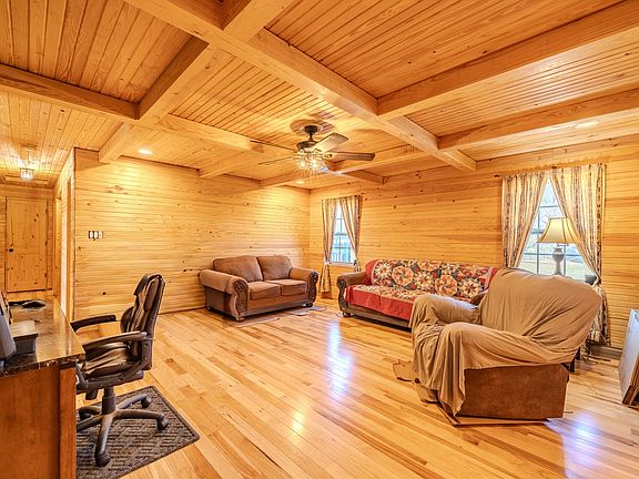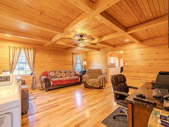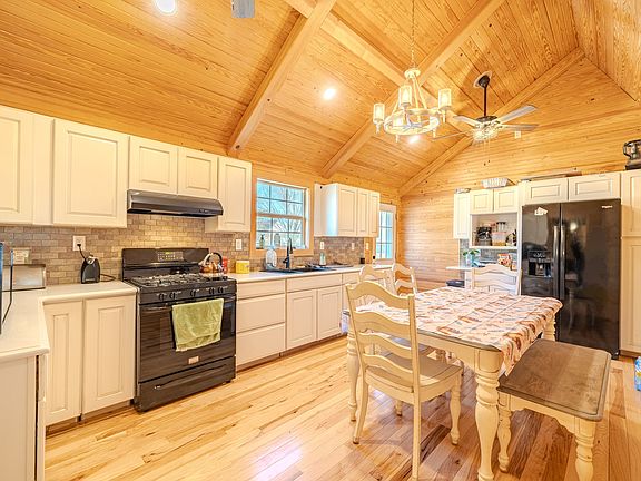 Well-maintained home featuring hardwood floors, tongue-and-groove wood walls and ceilings, and vaulted ceilings with exposed beams throughout. Open living and dining areas flow into the kitchen with ample cabinetry, tile backsplash, and coffee/breakfast bar. Spacious bedrooms include hardwood flooring and ceiling fans. Exterior features include a covered front porch, large rear deck, concrete driveway, fully fenced backyard, and storage building. An attached unfinished flex room offers excellent potential for a chill zone, sports cave, hobby room, or additional living space. Convenient Oakfield location with easy access to Jackson.