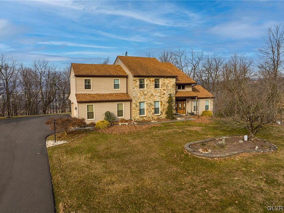 Custom 2 story colonial with a million dollar view. See the entire Lehigh Valley from your rear deck * 11 foot wide two story foyer with open staircase * Remodeled kitchen boasting custom cabinetry, tile back splash, stainless steel appliances, granite counters and matching granite table opens to the adjacent family room with stone fireplace * Formal dining room plus a huge formal living room with cathedral ceiling would be the perfect spot for a playroom * Master bedroom suite offers a nice size walk in closet and remodeled ensuite bathroom with loads of custom cabinetry and double sink with granite top * All bedrooms are nice size and one is already set up as an office with custom workspace cabinets and desk area * Covered patio * Composite deck off of family room where you can see for miles * Dual heat pump system * 2 car garage * Check out the pictures and video. You can see for miles!