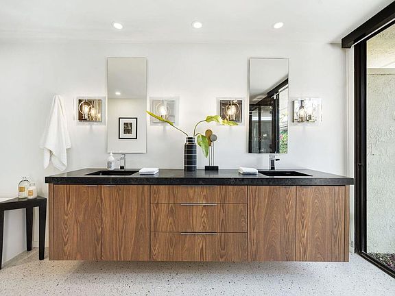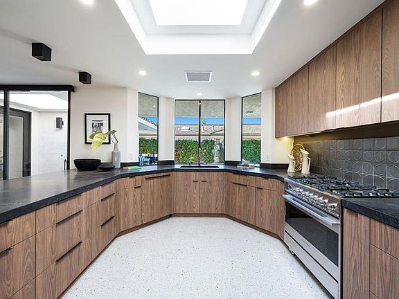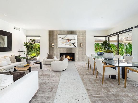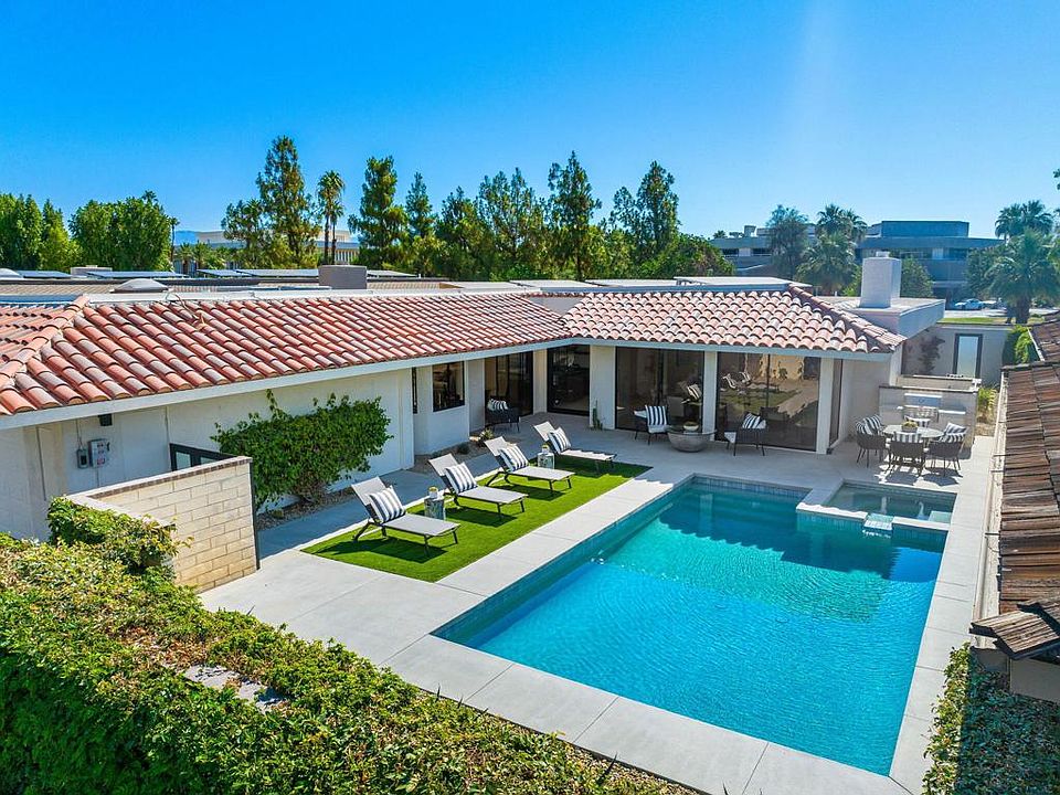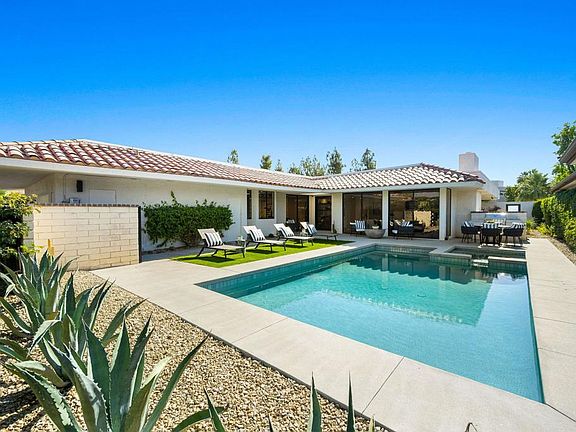 Now is your chance to own a gorgeous and rare free-standing and newly remodeled home in The Springs! An impressive glass pivot door greets you as you step into this Organic Modern designer home. A show stopping split-face stone fireplace, 36 x 36 porcelain terrazzo flooring and Level 5 smooth coat walls play beautifully off of one another. Warm tones of the soap stone-like quartz counter tops, walnut veneer custom cabinetry and Jonathan Adler handmade kitchen tile have a comfortable yet sophisticated feel. A 54'' refrigeration system and 5 burner Fisher-Paykel range round out this enviable kitchen. All bathrooms have high quality finishes and bedrooms feature custom built-in closets. Roller shades throughout with motorized shades in the living and primary bedroom for your convenience. The spacious and very private yard and large private pool have also been newly remodeled to include wi-fi compatible equipment, variable speed pump, Pebble Sheen finish and tile. The new acid washed concrete decking is expansive and perfect for lounging poolside and drinking in the gorgeous western mountain views. 28 panels of owned solar complete the package!The Springs is nestled in the heart of the Coachella Valley and features an active lifestyle of golf, pickle ball, tennis and bocce to name but a few.The stunning clubhouse plays host to numerous social activities throughout the year. Call today to see this beautiful home and experience The Springs for yourself!