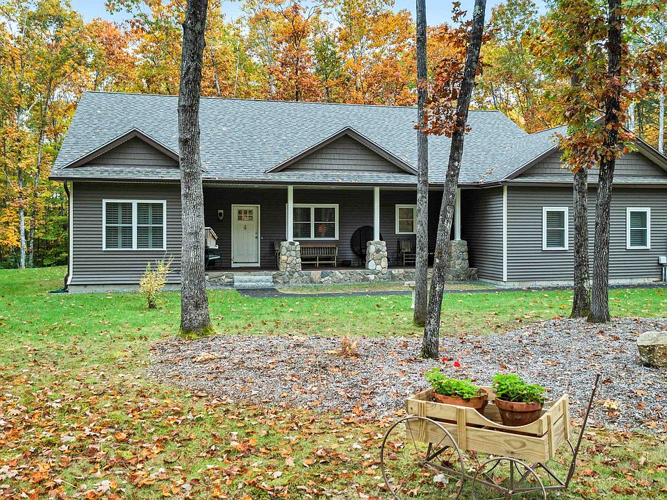 Welcome to your new "Pocket in the Woods!" This amazing, custom built home is nestled on a quiet 1.37 acre lot in desired Meredith. Built in 2018 by a builder in the neighborhood, this home features many incredible details plus added amenities by the current owner. With 9' lofty ceilings, the atmosphere is open and vibrant and lends to the wonderful feel throughout. Upon entering, one will find a lovely open concept living space accentuated by the wonderful stonework around the gas fireplace and hearth. French doors lead onto the serene back deck where one can sit and enjoy many seasons of tranquil nature. From the living, to the dining area, to the well appointed kitchen, the craftsmanship shines. Maple hardwood floors, stunning cabinetry, and Bosch appliances surround you in this heart of the home. To the other side of the living space is the guest wing with 2 nice bedrooms, a large full bath and laundry facilities. The 2 car garage features direct entry to the home as well as the finished access to the basement area. This is where your ideas will come to life with over 1400 sq ft of unfinished space ready to be transformed. Natural daylight pours into this room with the standard sized windows and a walk up full door access to the exterior. This could be a perfect in-law space leading to the paved driveway and lawn covered yard. All the while, privacy and woodlands wrap this home in beauty. You deserve this home in the Lakes Region!
