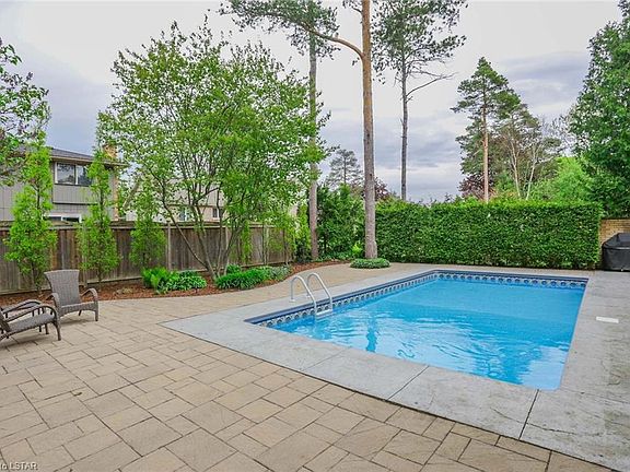 Meandering tree lined crescent in mature Byron neighbourhood. Picturesque curb appeal w/ covered entry. Turn key interior & beautiful decor. Rich hardwood flows from the foyer through to the living room, dining room & into the eating area of sunlit kitchen w/ its crisp white cabinetry, stainless appliances, breakfast bar, quartz counters & glass tile backsplash. Relaxing family room w/gas fireplace. 2nd floor offers 4 bedrooms including spacious Master suite w/ double closets & 3 piece ensuite. Rich hardwood carries through 2nd floor landing/hallway into two largest bedrooms. 5 piece main bath w/ double sinks. Finished lower level adds terrific rec room/media room, full bathroom, cedar closet & large bonus room w/ egress window! Gorgeous backyard with extensive patios, thoughtful landscaping & a fabulous heated pool surrounded by towering trees, cedars, fragrant lilacs & pyramidal oaks. Shingles 2010, windows 2013, driveway 2016 parks 4 cars. See media links.