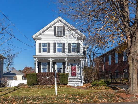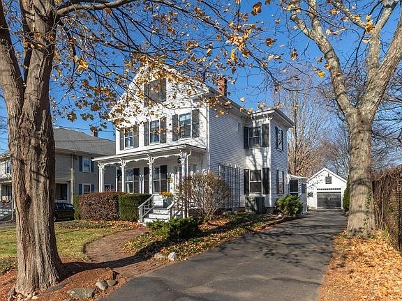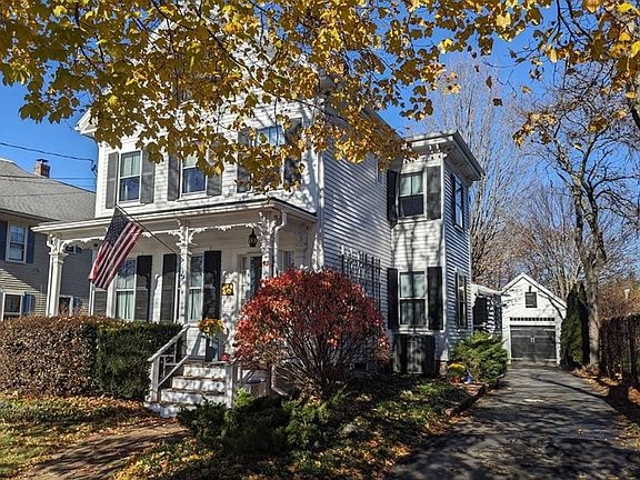 Elegance refined. Meticulously maintained and updated 1880's Victorian in a popular lakeside location. Period details beautifully blended into the 2020's. Original entry foyer and staircase lead to open concept living room and dining room with window bay, hardwood, lots of wainscotting and custom woodwork. Kitchen features newer stainless steel appliances, including convection oven, Corian counters, wood stove and it opens out to 26X10 glass enclosed sun splashed 3 season porch. 1st floor office with built-in desk, bay window and bookcase over looks large level landscaped back yard that includes a fabulous, grape vine trellised patio. 1st floor den off the dining room has additional custom built ins. Well-crafted built-ins and stained glass throughout. Hybrid efficient oil/electric FHA heating and AC systems have an oil boiler back up. Detached 1 car garage includes loft storage. Al this in close proximity Lake Quannapowitt, downtown restaurants, shopping and commuter rail.