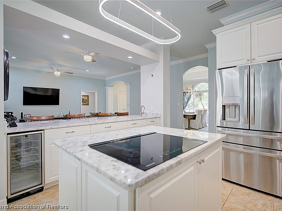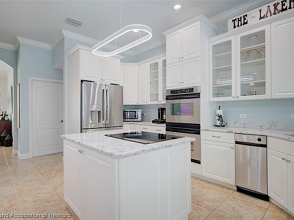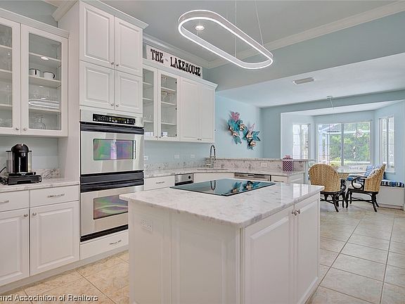 Upgraded luxury bathrooms with gorgeous quartz countertop and new fixtures. Grand master suite with spacious ensuite featuring an oversized corner tub, glassed in shower, double vanity, Walk in closet. Heated caged, saltwater pool, new pool heater. Dock has dual lift boathouse with new lift cables and cradle. Gorgeous sunsets!! Home has been freshly painted inside and out.