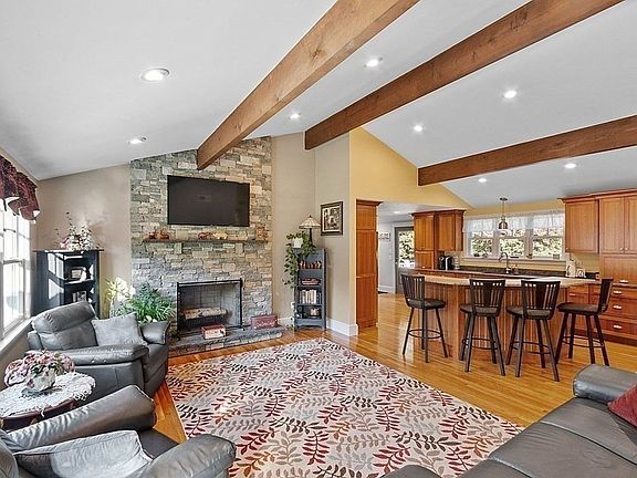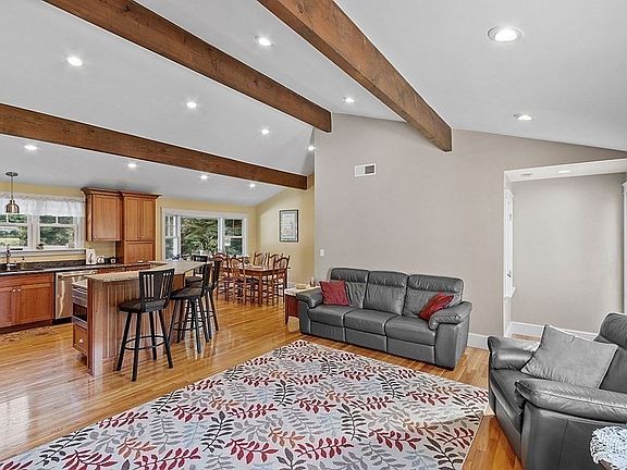- Features: Cathedral Ceiling(s), Beamed Ceilings, Flooring - Hardwood, Countertops - Stone/Granite/Solid, Kitchen Island, Breakfast Bar / Nook, Cabinets - Upgraded, Deck - Exterior, Exterior Access, Open Floorplan, Recessed Lighting, Remodeled, Stainless Steel Appliances, Pot Filler Faucet, Gas Stove