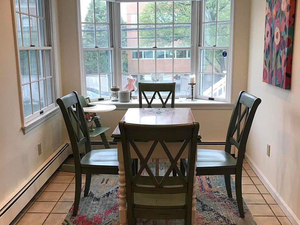 Peaceful waterfront (tidal) top floor apartment with shared park like grounds This is a fantastic opportunity to be downtown, walk to the train and close to I-95 location. This is a second floor/third floor bedrooms apartment. Great sunlight and wonderful layout. 18 x 15 living room, 25 x 7 kitchen with breakfast nook, two bedrooms 15 x 14. Hardwood floors in living room, hallways and bedrooms. There are two lovely balconies with azek decking off the master bedroom and living room.The entrance is off of a flight of exterior stairs. Tenant responsible for snow. Grounds are taken care of by the landlord. Off Street parking. Washer and dryer in unit.