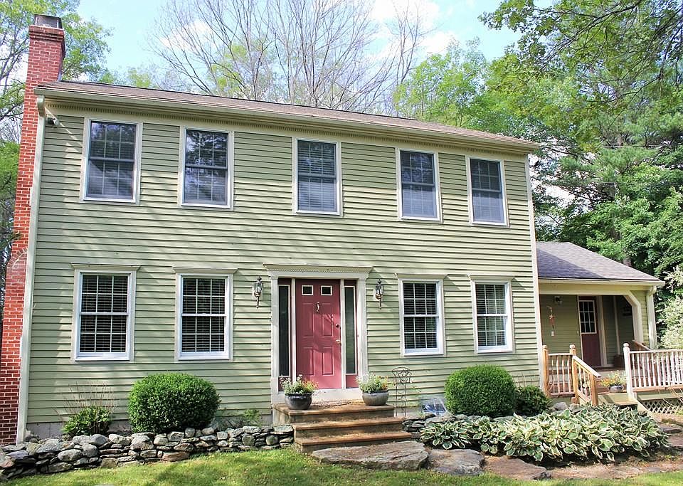 Tucked away off the beaten path you'll find this spacious 4 bedroom Colonial in an established neighborhood. The stone walkway leads you to a convenient covered front porch and into a mudroom with laundry. The 1st floor offers an open floor plan between the dining room, kitchen and family room. The cathedral ceilings and skylight in the kitchen and mudroom lets in abundant natural light. Buyers will love the cozy, fireplaced living room and numerous custom built ins throughout. A 1st floor bedroom with a beamed ceiling offers great views of the spacious yard. Upstairs are 3 more bedrooms, including a master suite and a hall bath with a double sink. The lower level features a partially finished den and garage access. Recent improvements include fresh interior paint, granite counters in the kitchen and full baths, a remodeled half bath and all new stainless steel appliances. The mature landscaping offers privacy and tranquility with perennials galore, a stone wall, and a fire pit area.
