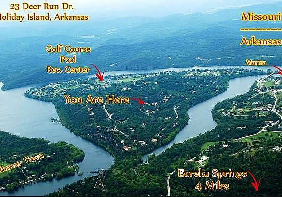 This 3 bedroom 2 bath home with a full basement has tons of space to do with what you want. The front door has a ramp leading up (not ADA compliant) which makes the hauling in of treasures and self easy. This property that almost entirely faces south is perfect for a second home, first home, retirement or rental. (It has renters until the contract runs out in a few months) Almost all windows face south for that winter solar heating but the trees keep it cool in the summer. 1000 square feet of deck is more than ample and leads right to the backyard and valley views. The view across the valley is amazing anytime of the year. This house is on 'The Island' and close to many of the amenities Holiday Island has to offer. You are less than 5 minutes from the pool, golf course, small clubhouse, Holiday Island Marina and The Barn. You are less than 10 minutes from the Main Clubhouse/shop/restaurant, grocery store, pharmacy, gas station, hardware store and more! You are less than 5 miles away from Historic Eureka Springs which is always in the top 10 must see Art Towns in the USA. Eureka Springs also has a full hospital including an Emergency Room, trolley system and home to the famous Passion Play and Auditorium. You will never be bored in this area but at the same time peace is yours in this truly amazing Island home. If you do want a little more excitement Branson, Missouri is just a 30 minute drive away! This fabulous dwelling is also only an hour away from the University of Arkansas, Crystal Bridges Museum of Art, Shopping Malls, lots of restaurants, several airports, 100's of miles of trails and the list keeps going. New in 2015: Gutters New in 2017: Windows and some landscaping New in 2018: Central Air Unit, Carpeting upstairs, Paint throughout and windows, This is one of those 'Must See' Homes! By Appointment Only! Please message us here or text our phone for an appointment... thank you.