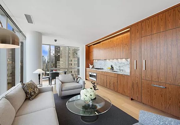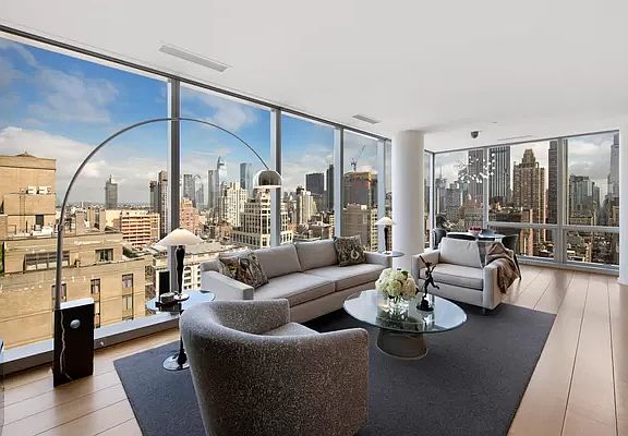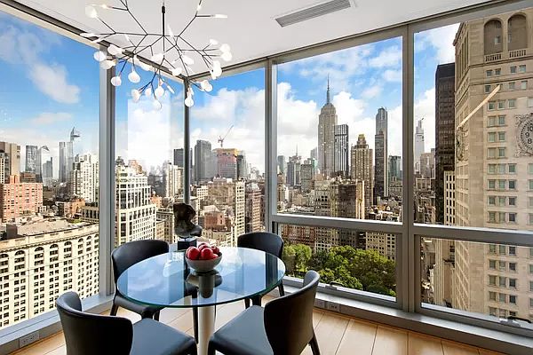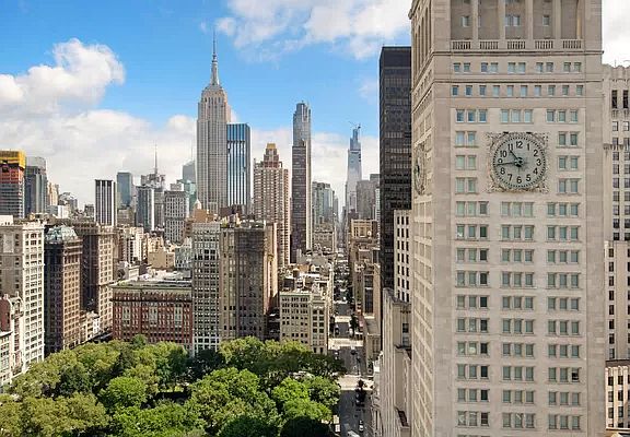 Turnkey Corner 2-Bedroom with Cinematic Skyline Views Perched at the nexus of Flatiron, Gramercy, NoMad and Chelsea is this rarely available corner two bedroom, two bath residence spanning 1,328 square feet with triple exposures. Its unique features include floor-to-ceiling walls of windows affording unobstructed iconic Manhattan skyline views overlooking Madison Square Park and the Empire State Building. The ideal residence for Pied-a-terre or Primary use. Be greeted by the expansive 26-ft living/dining room, affording the ideal spot to entertain and enjoy the breathtaking, panoramic sunset views. The open kitchen is replete with burled custom Luoro Preto Rosewood cabinetry, and Carrara Marble, integrated with Gaggenau appliances. The thoughtfully designed split bedroom layout features the north-facing primary suite overlooking the Empire State Building and Madison Square Park complete with the en-suite bath evoking spa-like features clad in Italian travertine and a Carrera marble countertop double vanity, deep-soaking tub, and separate shower. The south-facing corner second bedroom showcases panoramic city and river views with ample storage throughout. Adorned in 9-foot wide solid quarter sawn white oak floor, this home boasts approximate 10-foot ceilings, Bosch washer/dryer, Central heat/AC, Lutron lighting, and multi zoned Nest thermostats. Automated window shades have been fully installed throughout the apartment. A private storage bin conveys with sale. One Madison at 23 East 22nd Street is a 60-story bronze glass-clad tower, designed by award-winning architect CetraRuddy. Residents enjoy 10,000 square feet of world-class amenities designed by Yabu Pushelberg. This includes a full-time doorman and concierge, great room with lounge and dining room, parlor room, screening room, and a butler-staffed catering kitchen. The Spa & Fitness Level hosts a state-of-the-art fitness center, yoga room, indoor pool, spa with glass-enclosed steam room, and children's playroom. Conveniently located near Fifth Avenue boutique shopping, fine dining, and entertainment.