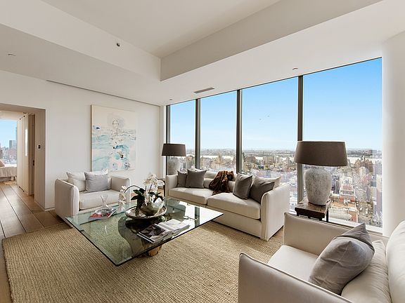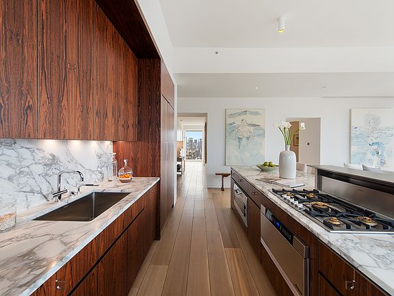 Full-floor residence with private terrace offering three bedrooms, three full baths and powder room, with keyed elevator entrance onto a private foyer. The wraparound terrace offers dramatic 360-degree, river-to-river views. The corner great room faces northwest and has terrace access. The open kitchen boasts custom kitchen cabinetry in satin-rubbed Indian Laurel veneer with Calacatta Borghini marble countertops and has Gaggenau kitchen appliances. The master bedroom suite features a master bath with a soaking tub, separate windowed stall shower and custom double vanities. All bedrooms include en-suite baths. The interiors were designed by Cetra/Ruddy and feature 9-inch wide plank solid white oak flooring and high-end finishes throughout including opulent stone surfaces in the baths, from Italian Travertine to Calacatta Gold with Crema Delicato and Thala Grey marble vanity countertops.