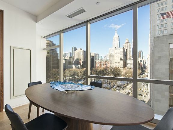 Captivating views of Madison Square Park and the Empire State Building await you in this 1,560 SF 2 bedroom, 2 bathroom residence. Located at One Madison, an iconic downtown condominium, this never before lived in home is a well-appointed retreat in a vibrant neighborhood. Floor to ceiling windows, 9 wide white oak hardwood floors and loft like ceilings greet you upon entering this 9th Floor residence. Finishes include a kitchen tailored with custom cabinetry, calacatta marble countertops and integrated appliances by Gagganau. The kitchen is open to the living room providing excellent space for entertaining. The master bedroom is tucked away in the rear of the residence. The master bath features opulent stone surfaces from Italian travertine to rich marbles, a soaking tub and sleek shower. Further, the unit is appointed with central heat and air, washer/dryer, and automated shades. One Madison Park Condominium was completed in 2014 and offers 10,000 SF of lavish amenities including a fully equipped fitness center with yoga room, swimming pool and glass encased steam room, all facing Madison Square Park. Additionally, there is a parlor lounge with an elongated fireplace, childrens playroom and intimate screening room. Neighborhood amenities include Eataly, Eleven Madison, and events year round at Madison Square Park.