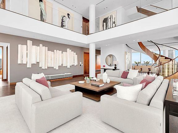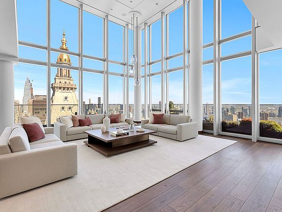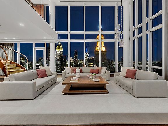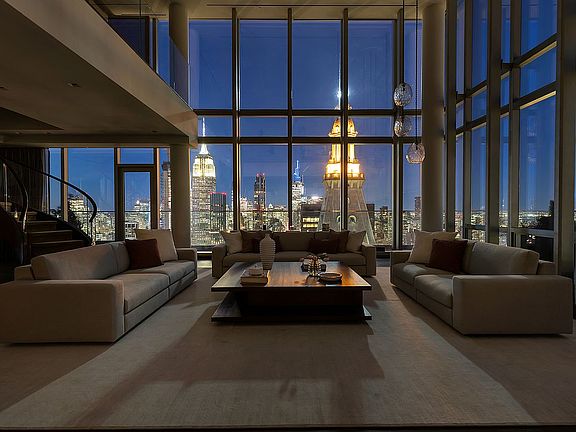 At the pinnacle of One Madison, the Triplex Penthouse spans almost 7,000 square feet of expansive living space from the 58th to the 60th floor. The striking double-height windows offer panoramic 360-degree vistas of the skyline and both the East and Hudson Rivers. Providing an unparalleled viewpoint of Manhattan and its iconic structures. Crafted with meticulous attention to detail, this residential marvel exudes sophistication and timeless elegance. The heart of this magnificent home is the double-height Great Room, with its soaring ceilings and a generous 586-square-foot terrace that invites entertaining against a backdrop of the city. The thoughtful floor plan also includes a formal dining room and a gourmet kitchen equipped with the finest appliances, complemented by a library and powder room on the main level for added sophistication. The grand circular staircase ascends to first of the bedroom levels, and a secondary staircase takes you to the third and level featuring a luxurious primary suite complete with a dressing room, marble bath with a freestanding soaking tub, and a rain shower. There are an additional four bedrooms with ensuite baths and a staff room that offers comfort and privacy. A private internal elevator seamlessly connects all three levels, ensuring effortless movement throughout the residence. Residents of One Madison are afforded a collection of exclusive amenities that underscore a commitment to a lavish lifestyle. The presence of a full-time doorman and concierge, along with exclusive access to the One Club—with its indoor pool, steam room, state-of-the-art fitness center, and elegant social lounges—elevates everyday living to the extraordinary. The vicinity of One Madison shines with culinary stars like Eleven Madison Park, The Clocktower, and Gramercy Tavern, alongside innovative establishments such as Koloman, Atomix, and LittleMad. This Triplex Penthouse is not merely a home; it's a testament to the allure of elevated living in Manhattan, combining the art of fine living with breathtaking vistas and premium amenities. An address at One Madison Park is not just a location; it's the centerpiece of New York's prestigious landscape, an iconic home at the center of it all.