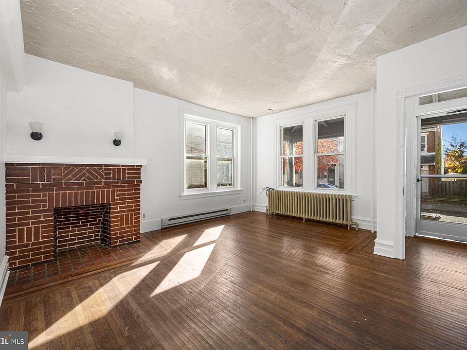 Welcome to 23 E 2nd Street - 1st Floor, a bright first-floor unit offering generous room sizes and original character throughout. The large living room features hardwood floors, tall windows, and a decorative brick fireplace that adds charm. A separate dining area provides flexible space for everyday living or a home office. The kitchen offers updated flooring, ample cabinet storage and natural light, with easy access to the rear entry and patio. Enjoy the spacious bedroom and a full bathroom with updated flooring and vanity. Hardwood floors run throughout most of the home, and the large windows bring in great natural light. A covered front porch and rear patio extend your living space outdoors. Close to shops, restaurants, parks, and public transportation.