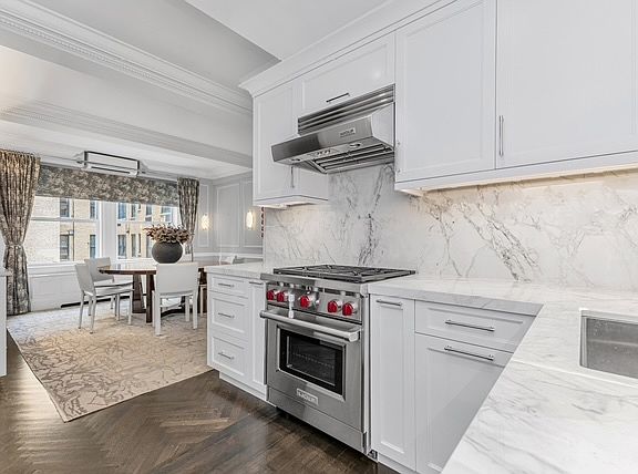 The new chef's kitchen by Bilotta features Cosentino stone-slab countertops and Wolf, Miele, and Thermador appliances - ideal for both everyday living and refined entertaining. A formal dining area flows seamlessly for effortless gatherings.