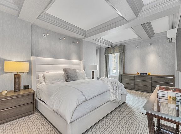 Enter from a semi-private landing into a grand 25-foot corner living room with soaring coffered ceilings and oversized windows capturing iconic Upper East Side views. Light, volume, and proportion define every inch of this sophisticated space.